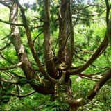 鳥海群杉は、秋田県の鳥海山山麓に見られる天然スギの群状林で、標高600〜650mの冷涼多雪地帯に分布しています。この地域のスギは、積雪によって幹が倒れ伏すことで地面に接した枝から発根し、そこから新たな幹が立ち上がる「伏条更新(ふくじょうこうしん)」によって繁殖しているとされ、耐雪性に優れた樹形を持つのが特徴です。